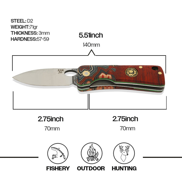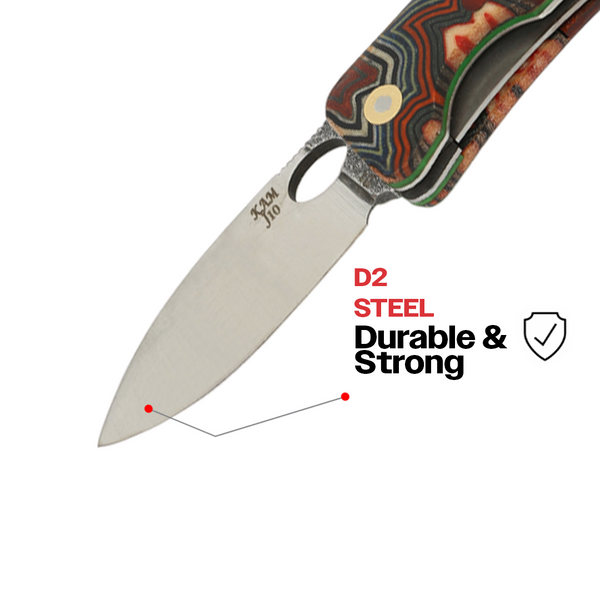 Çakınızın kalbi, yüksek karbon içeriğine sahip D2 çelik bıçakla atıyor. Bu bıçak, keskinliği uzun süre koruma yeteneğiyle ünlüdür. Hassas zemin işlemesi sayesinde uzun süre dayanıklı bir keskinlik sunar. Hem günlük kullanım hem de zorlu koşullar altında yüksek performans sağlayan D2 çeliğinin mükemmel uyumu, bu çakıyı rakiplerinden ayırıyor.