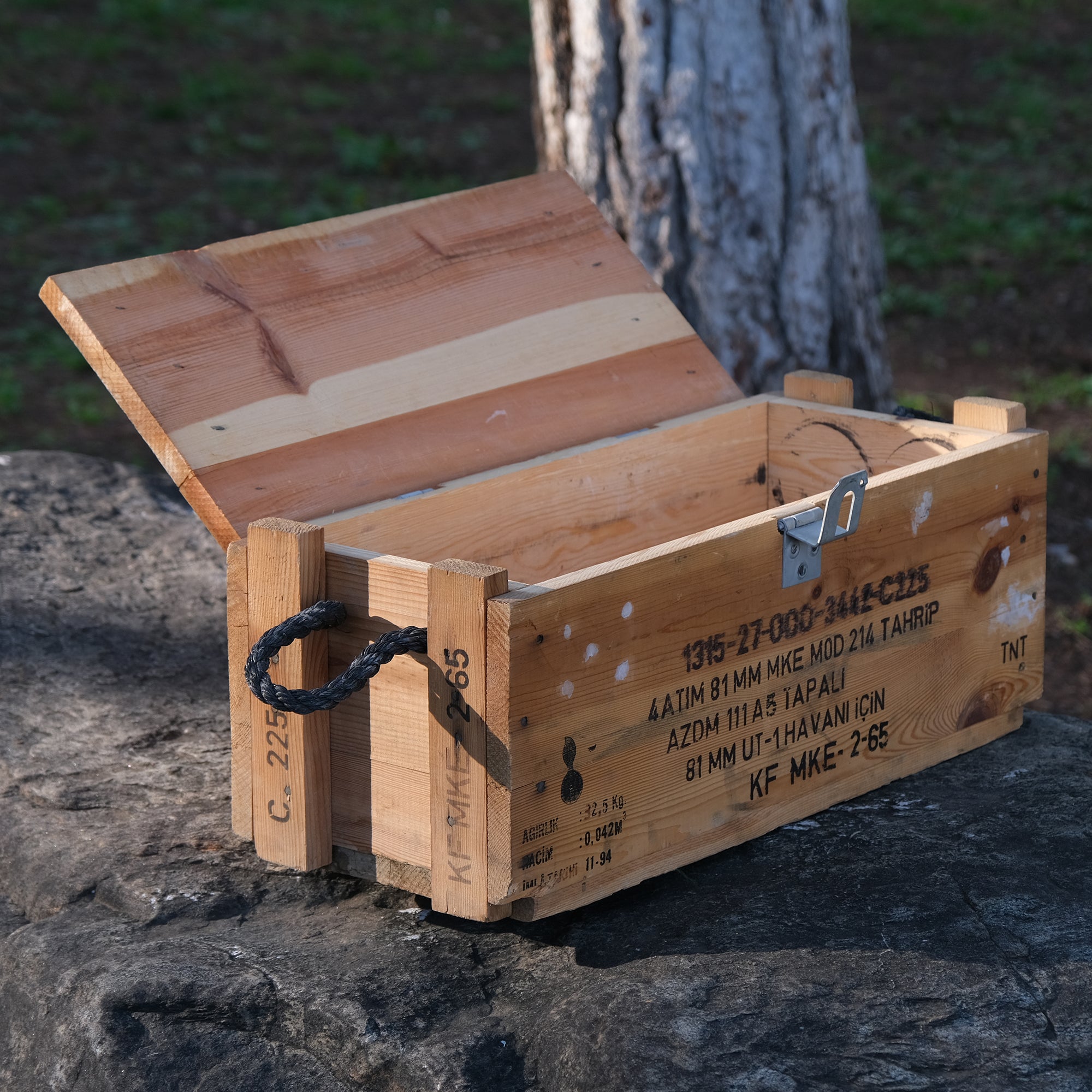1950–1980 döneminde üretilmiş, yıllara meydan okuyan gerçek ahşap mühimmat sandıkları şimdi koleksiyon ve dekorasyon severlerle buluşuyor. Her biri geçmişten izler taşıyan, karakter sahibi özel parçalardır.